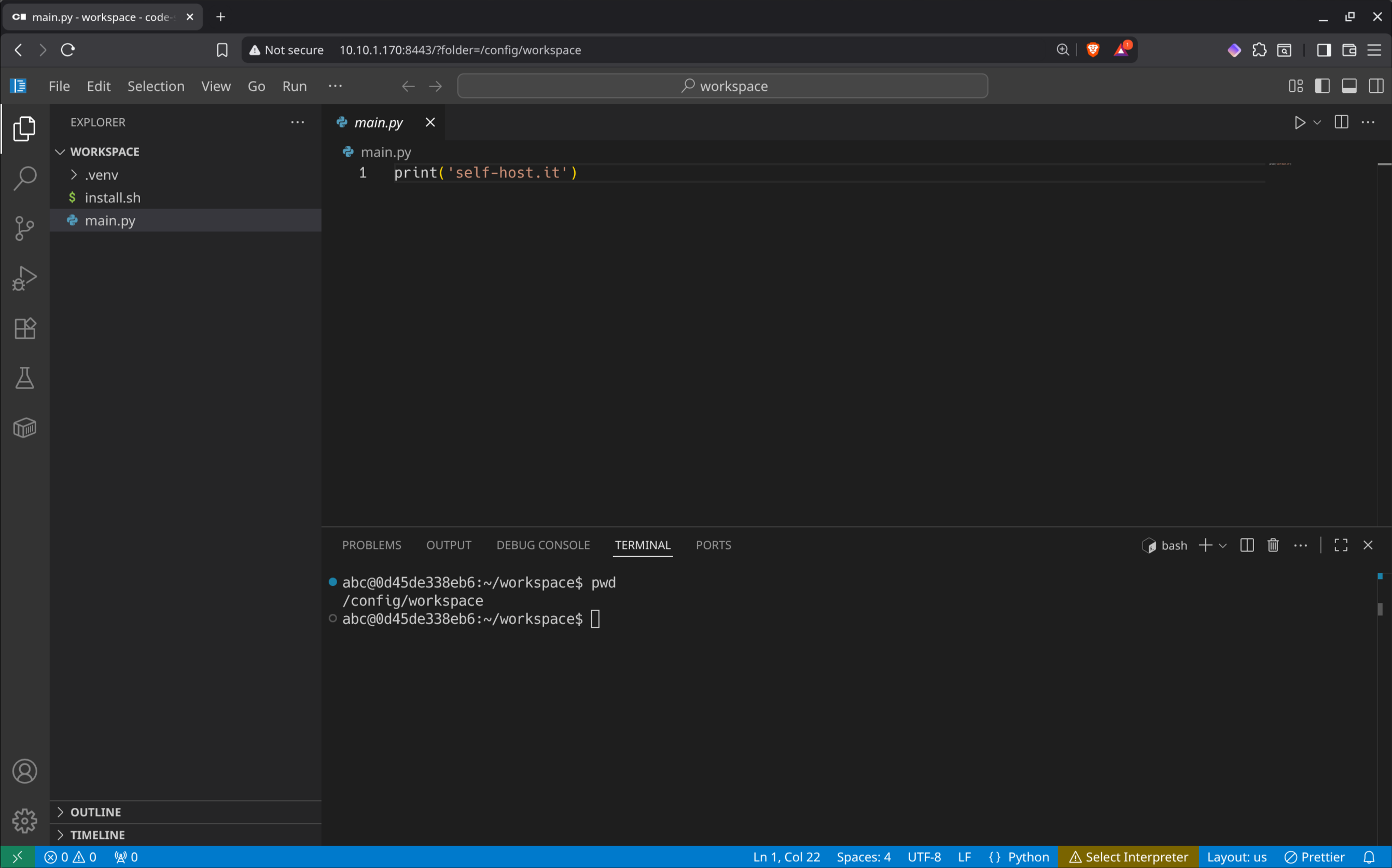 Il codice sopra considera l’installazione dell’applicativo per la versione 3.12 di Python, quindi sarà necessario installare la versione corretta, corrispondente alla versione installata in locale, se diversa.Dopo aver completato le installazioni, sarà necessario attivare l’ambiente virtuale tramite il terminale utilizzando il codice sotto, che creerà un ambiente venv insieme alla sua cartella dove saranno installate tutte le librerie e le dipendenze necessarie. Per mantenere l’ambiente e le installazioni persistenti, eseguire lo script nella cartella di lavoro /config/workspace.